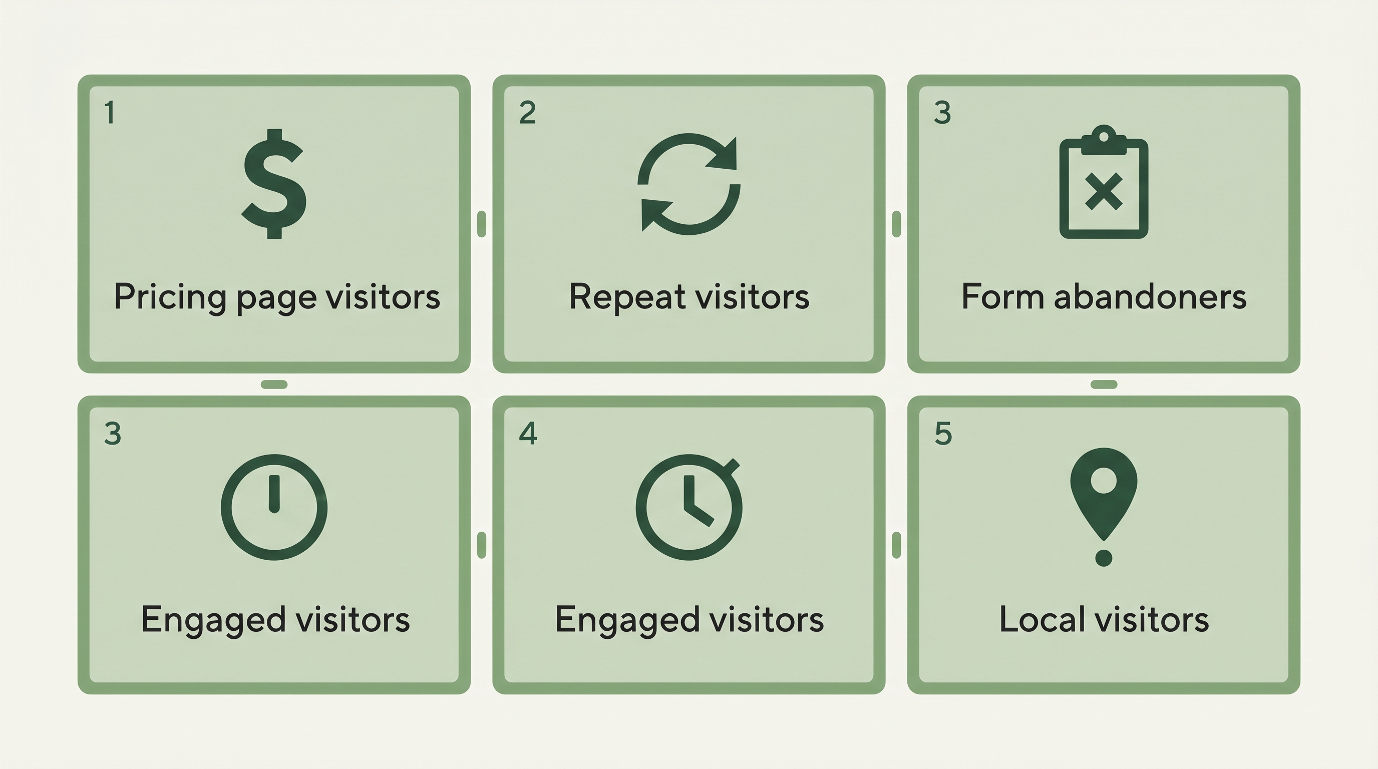 1. Pricing Page Visitors (Non-Converters) — Your highest-intent remarketing audience. These people were evaluating you. Hit them with a follow-up ad that addresses common objections or offers a free consult.