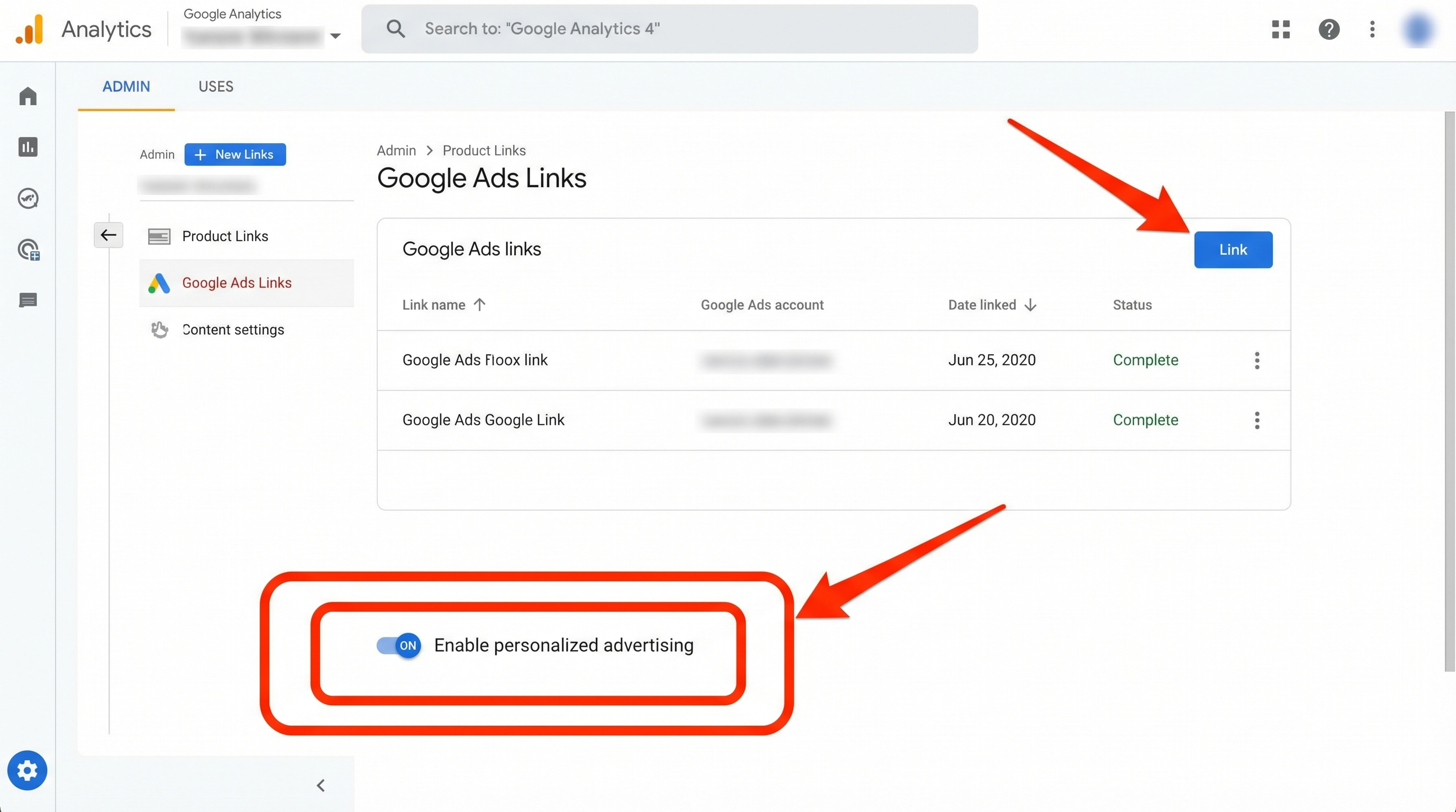 In GA4, go to Admin → Product Links → Google Ads Links and connect your Google Ads account. When you do this, make sure the "Enable personalized advertising" toggle is turned on. Without it, audiences you build in GA4 will stay in GA4 — they won't flow over to Google Ads where you actually need them.
