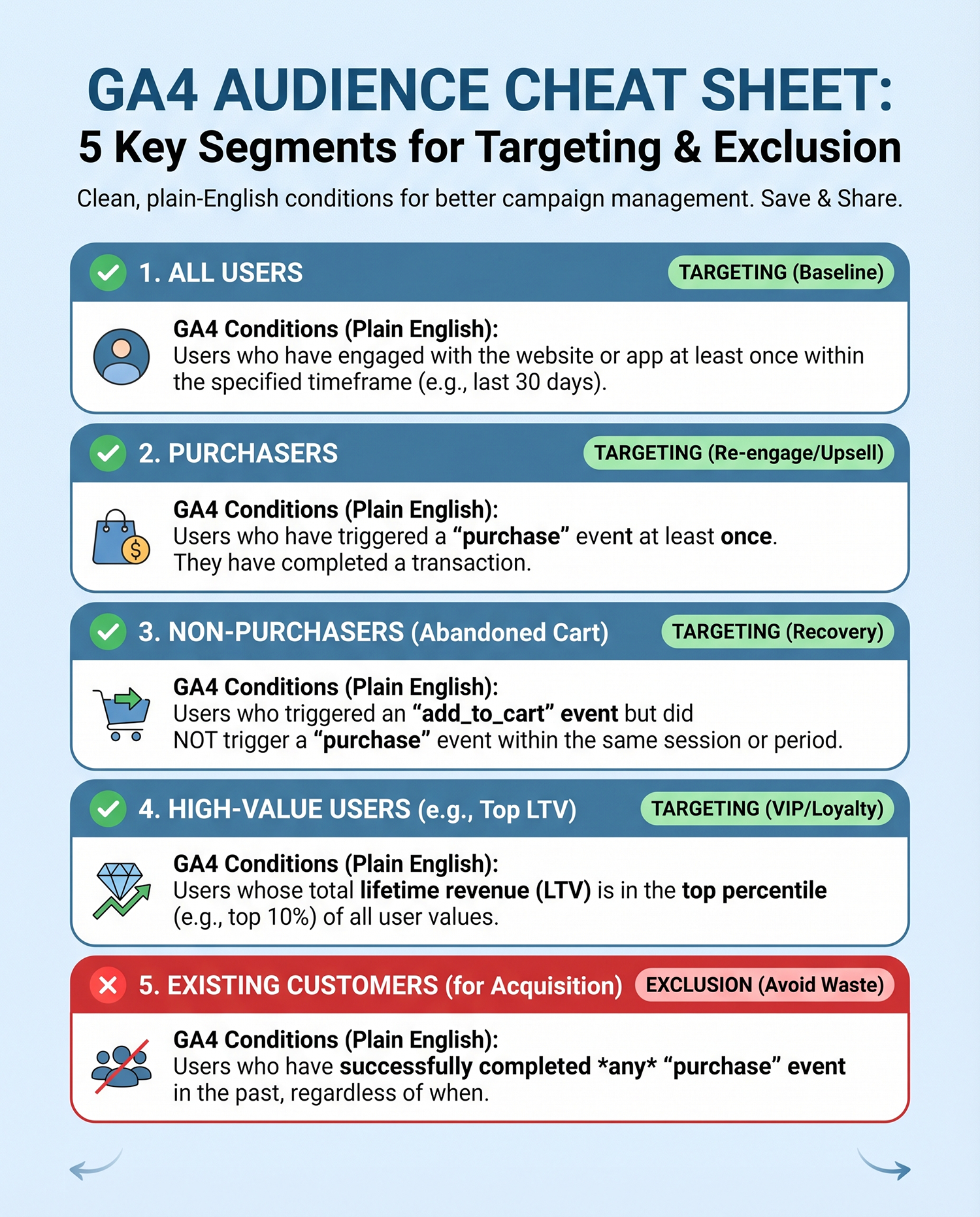 4. Past Converters (Exclude from Lead Gen) — Anyone who triggered your primary conversion event in the last 60–90 days. Exclude from lead generation campaigns, but consider targeting them separately with upsell or review-request messaging.