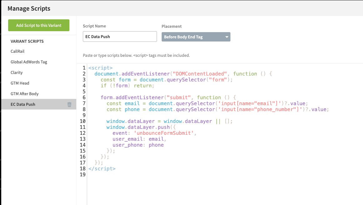 We’re using a Custom Event trigger (unbounceFormSubmit) instead of a generic form submission because Unbounce pushes its own event into the dataLayer when a form is successfully submitted.