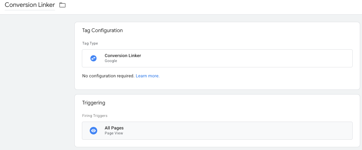Do not forget the Conversion Linker tag. The conversion linker tag stores Google ad click information (such as gclid parameters) in first-party cookies on your website, allowing Google's advertising platforms to track conversions accurately. For optimal results, leave your trigger set to “All Pages”.