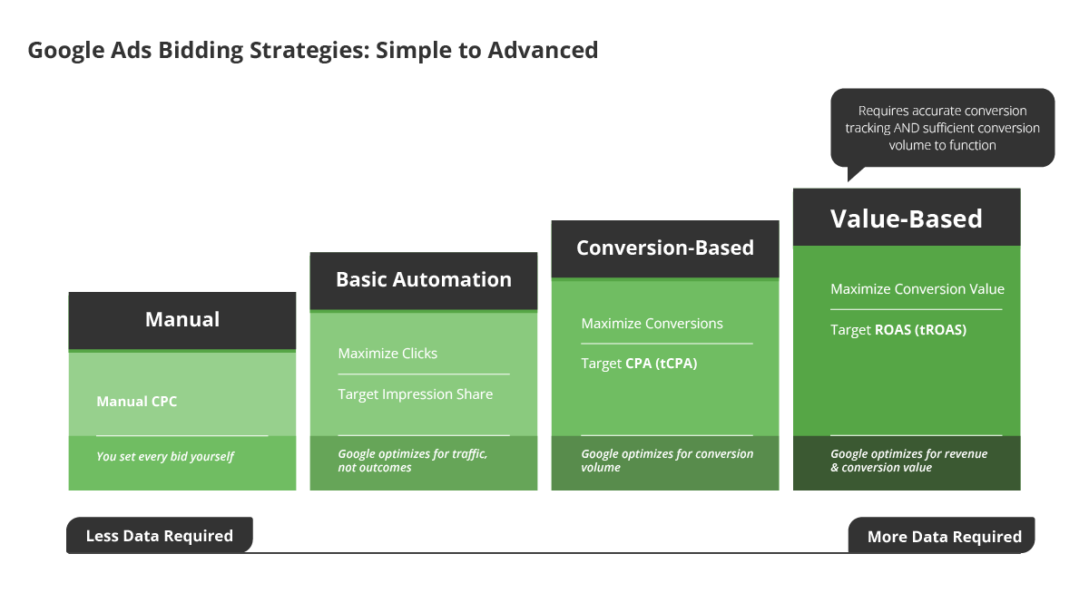 This is different from simpler strategies like Manual CPC (where you set every bid yourself) or Maximize Clicks (where Google just tries to get you as many clicks as possible without caring what happens after the click).