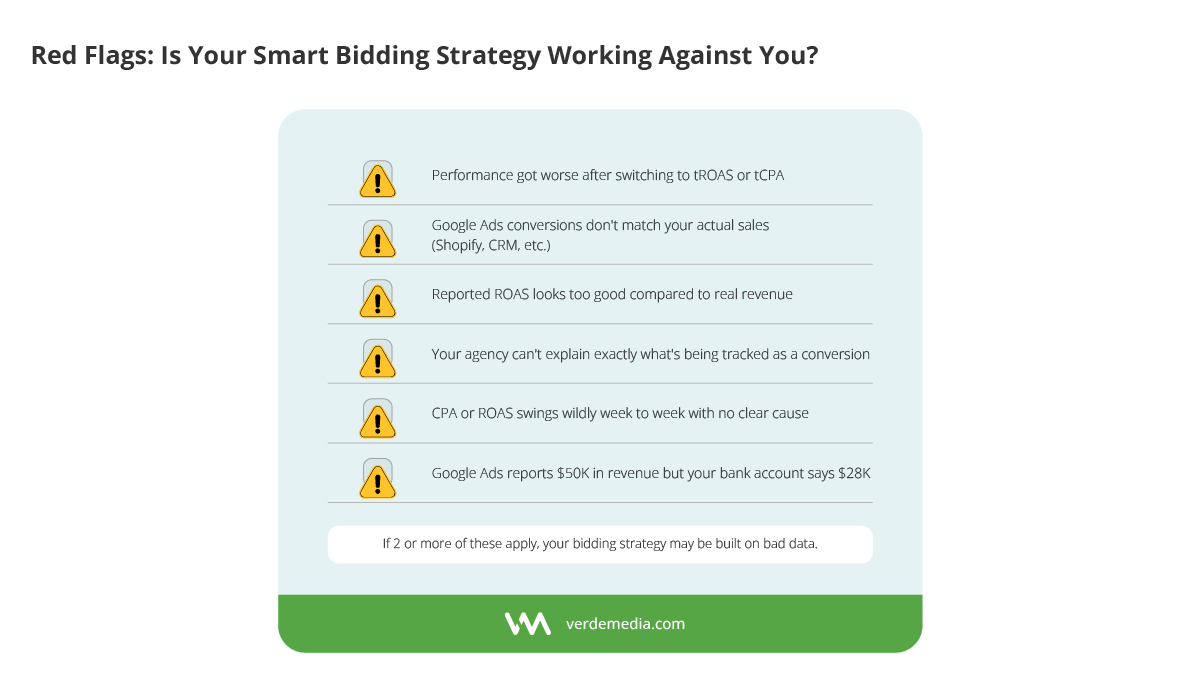 If you're running Smart Bidding and things feel "off" but you're not sure why, here are the red flags to look for. You don't need to be a Google Ads expert to spot most of these.