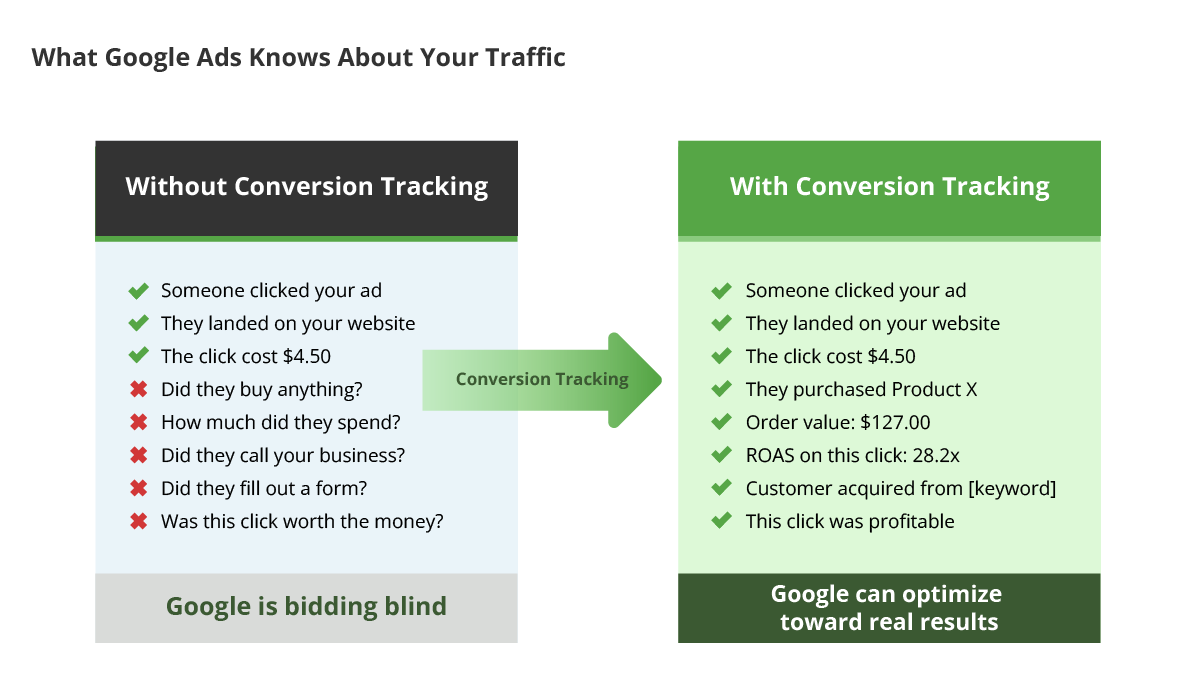 Conversion tracking is the mechanism that tells Google Ads what happened after someone clicked your ad. Did they buy something? Fill out a form? Call your business? Add something to their cart? And critically — how much was that action worth?
