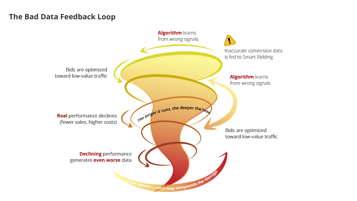 But here's the part Google glosses over: these strategies are entirely dependent on the data you feed them. The algorithm doesn't know what a "good" outcome is on its own. It only knows what you tell it through your conversion tracking. If that data is wrong, incomplete, or missing entirely, the algorithm doesn't stop and ask questions. It just optimizes toward whatever signal it has — even if that signal is garbage.
