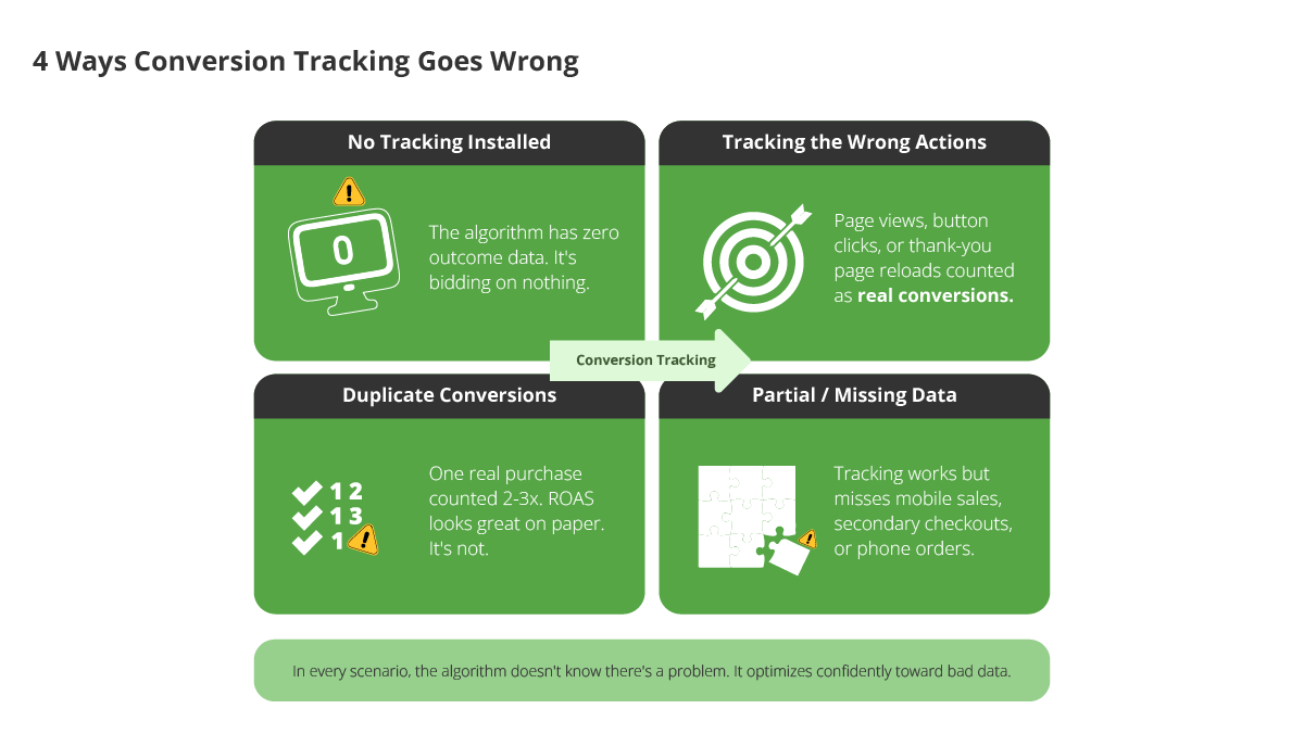 Here's the problem: if your conversion tracking isn't set up correctly — or isn't set up at all — you just handed the algorithm a blindfold and a steering wheel. It's going to drive with absolute confidence. It's just not going to drive anywhere good.