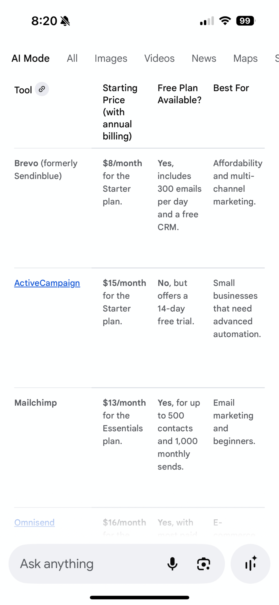 I clicked over to the AI Mode tab and asked the same question: "What are the best marketing automation tools for small businesses under $200 per month?"