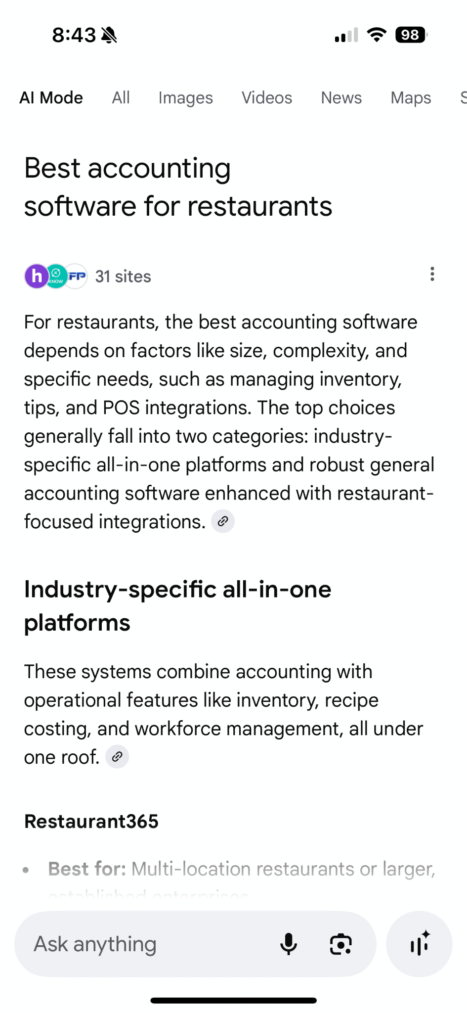 Here's a concrete example: If you search "best accounting software for restaurants," traditional Google gives you links to articles from various software review sites, individual product pages, and blog posts. You'd need to visit multiple sites, compare features yourself, and synthesize the information.