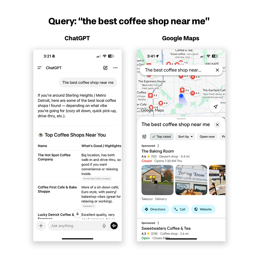Try this experiment: ask ChatGPT or Claude for "the best coffee shop near me." You'll get a generic response asking for your location, followed by general advice about what makes a good coffee shop.